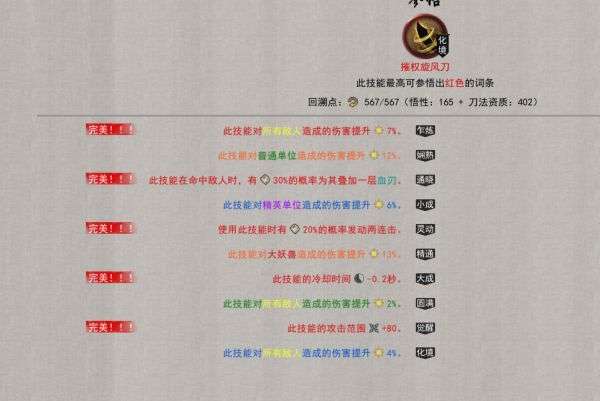 说到这里有人会问,为什么不用半月刀,烈火刀,而用旋风刀呢,看第5条,20%几率两连击,这就注定了,旋风刀,天生比其他武技多20%输出旋风刀最核心的词条只有2个,(命中叠加血刃和20%几率发动2连击)这里肯定会有人反驳我,说最重要的是技能冷却0.2秒,我只能说他们并不了解鬼谷的算法机制鬼谷的算法是加算法,是先结算这0.2秒的时间再算百分比,所以如果你技能减CD能到达100%就不需要这个0.2秒的词条,如果达不到100%减CD 这0.2秒才有用。