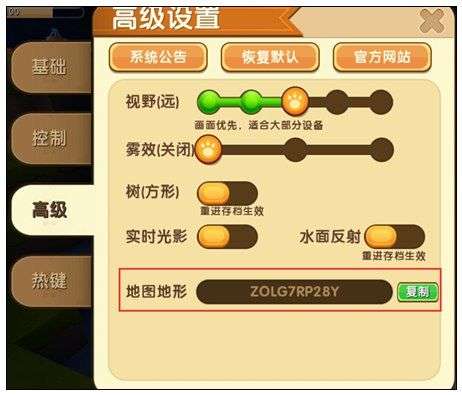 同时,玩家在选择模式的时候,你也可以自己进行设置,在难度的下面,你可以找到地形码的设置,如果你输入地形码,进入地图之后,就是你输入地形码的地图,如果不输入地形码,就是采用随机生成的方式,随机生成的方式,在游戏中你想要找自己需要的地形,还是比较困难的。
