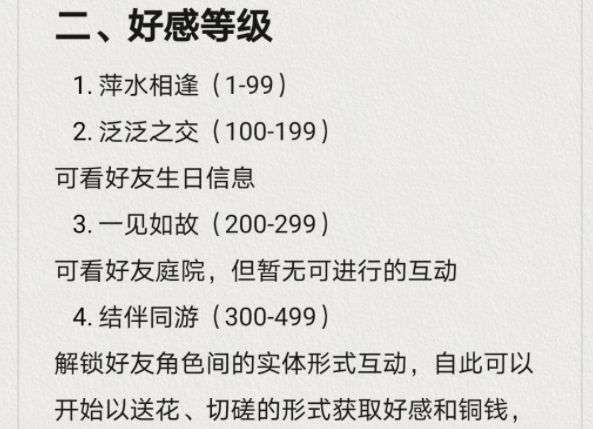 解锁好友角色间的实体形式互动,自此可以开始以送花、切磋的形式获取好感和铜钱,还可以随手给好友盖章(此行为不加好感)
