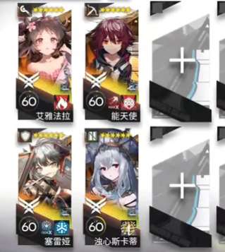 开局如图所示顺序部署:艾雅法拉(向左)→ 塞雷娅 → 浊心斯卡蒂 → 能天使(向上)