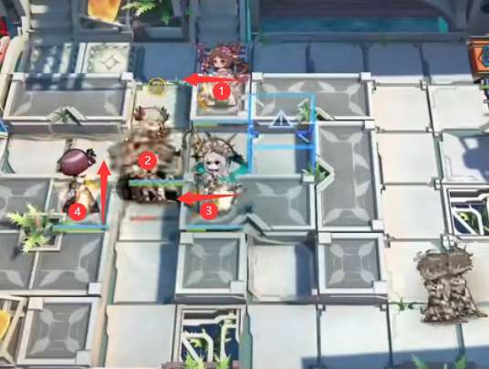 能天使带的是过载所以要对轴,下方2个敌人走出红蒂下面那格时,放能天使朝上即可。