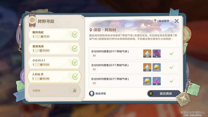 本次的挑战地点位于须弥的阿如村当中中,气球的点位也是分成了上下两层的一个路线,我们可以先从下层走,或者先采集上层都是可以的
