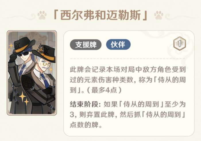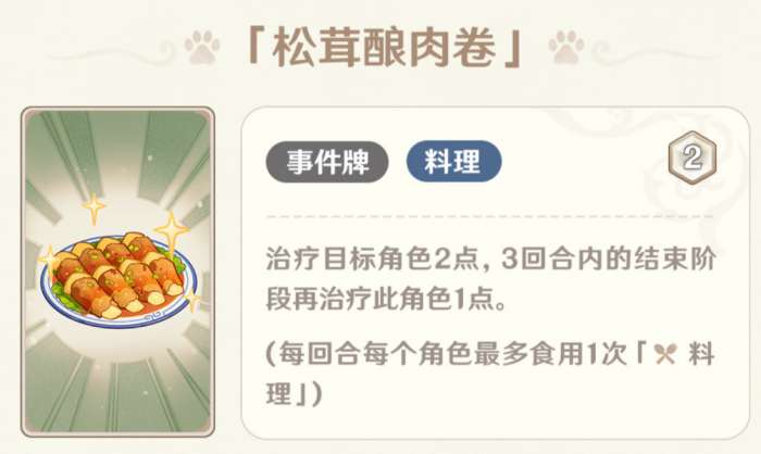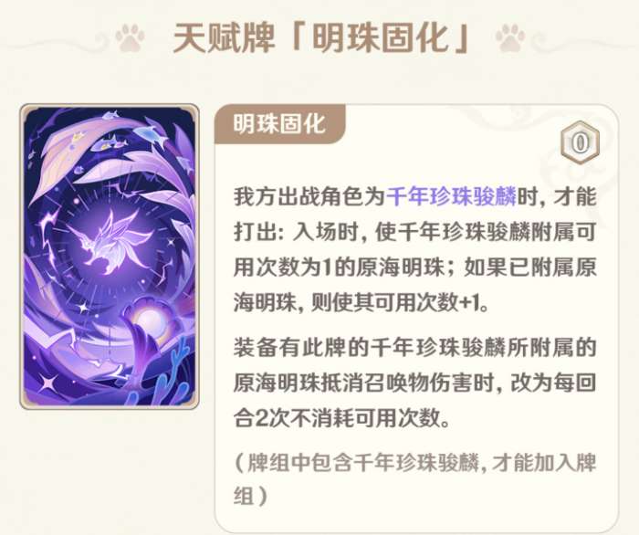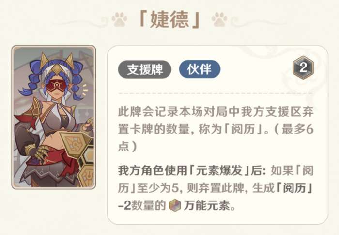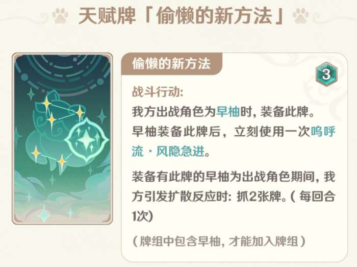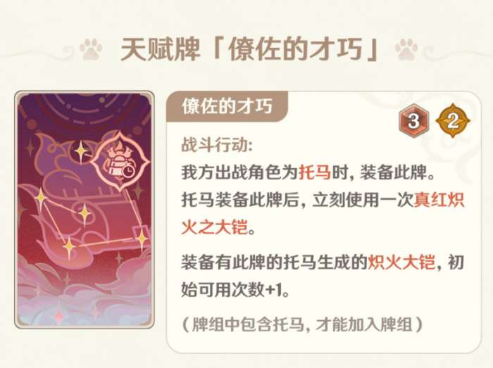 天赋牌每回合一次免费抓2牌,还是非常优质的过牌手段,但是考虑到配合班尼特会污染天赋池子,因此在其它队伍或许会是一个不错的过牌手段