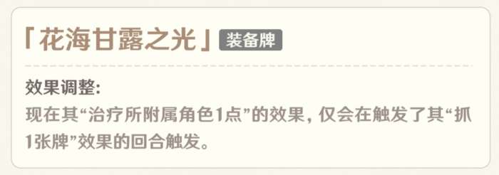 大花海的强度有目共睹,这一次是代替饰金之梦接下了设计师的这一刀。回合末回复生命值的效果必须要这回合挨打才会触发,一般来说这个角色的生命值一定会越大越少,但不妨碍大花海仍然是前台驻场输出角色前期非常优质的一张圣遗物,这是一个相对优秀的调整方案。