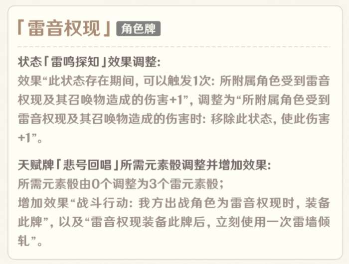 雷音权现无疑是4.3版本表现最亮眼的新角色,在各种体系的快攻卡组中都能登场,其核心竞争力在于每回合1次的稳定增伤,另外附赠一个锁头效果。众所周知3.3以后,新角色登场的第二个版本就被削弱这是史无前例的。不过你看这削弱削了么?如削。第一项调整砍了锁头效果,现在雷音权现每回合只有一次锁头机会,第二项把一个随时能装备的天赋牌改成了战技相关,实际上的数值效果却没有任何调整。这两项改动势必会影响到雷音权现配队及运营的灵活性,但并不影响其核心竞争力也就是高数值强进攻,因此雷音权现并不会因此而受到太大打击。