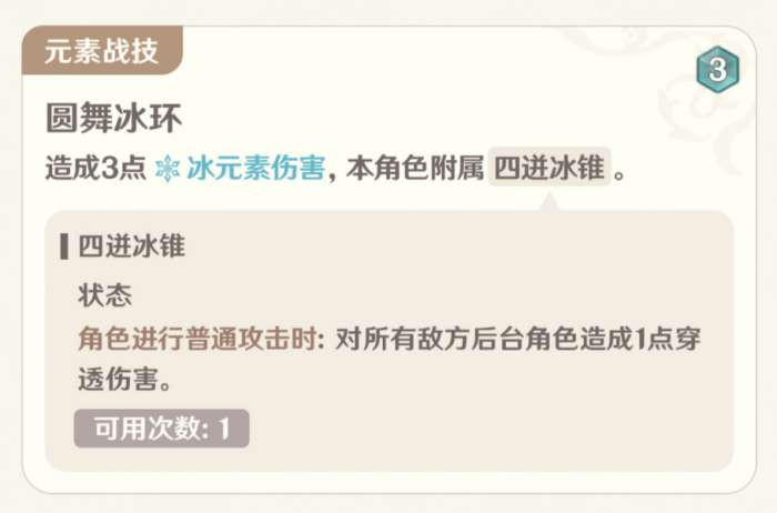 元素爆发3骰2充能,总伤6点,共3回合完全并且挂3次冰元素,可以算得上合模,同样是进一步对后台造成伤害,是一项优秀的驻场输出能力