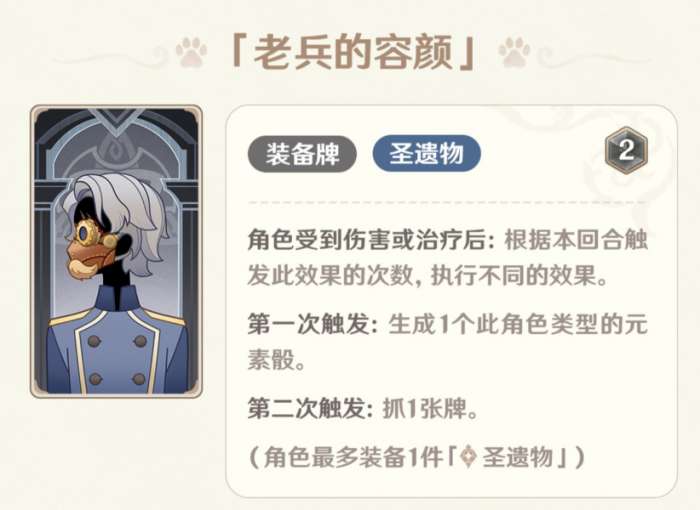 天赋牌0骰,却拥有如此多的额外效果,包括重新上减伤,叠盾,每回合扛2次召唤物,这对于召唤物卡组而言是严酷的考验,不过如果对手没什么召唤物那就显得价值不算太大了
