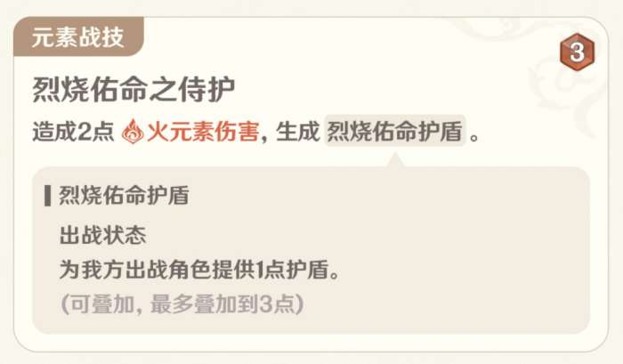 元素战技基础3伤,加上回1层盾,数值收益是完全过关的,3层盾已经可以说是非常硬了