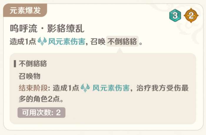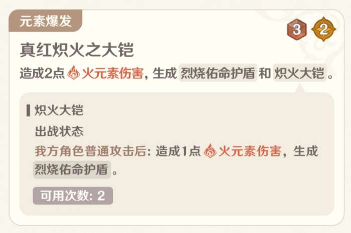 元素爆发3骰2充能,与行秋元素爆发非常接近,也是低数值协同攻击,附带了一点生存能力,但只有2可用次数,是用数值换的机制