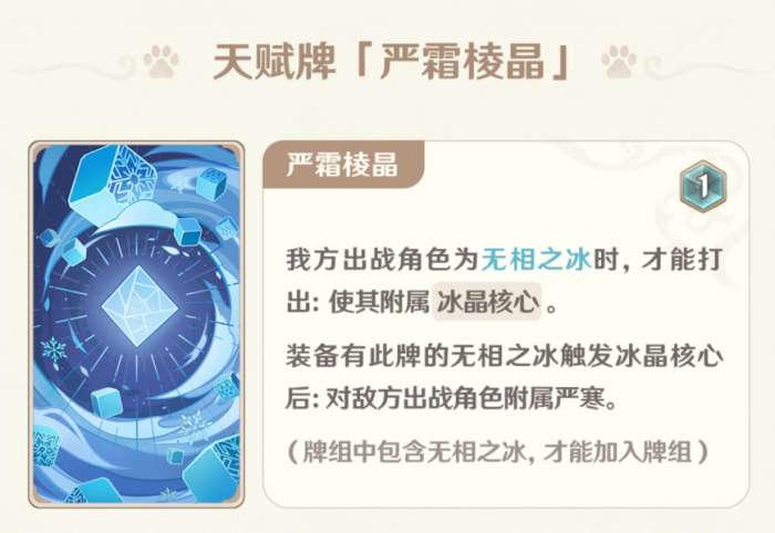 天赋牌仅需1骰,便可重新附属冰晶核心,继续赖在场上,面对没有多段伤害的卡组时约等于一个大煎蛋,能浪费掉对手许多行动,卡住赌徒的耳环,同时对自己的输出节奏影响并不大,在无相之冰驻场输出思路的前提下,是具有优秀价值的单卡