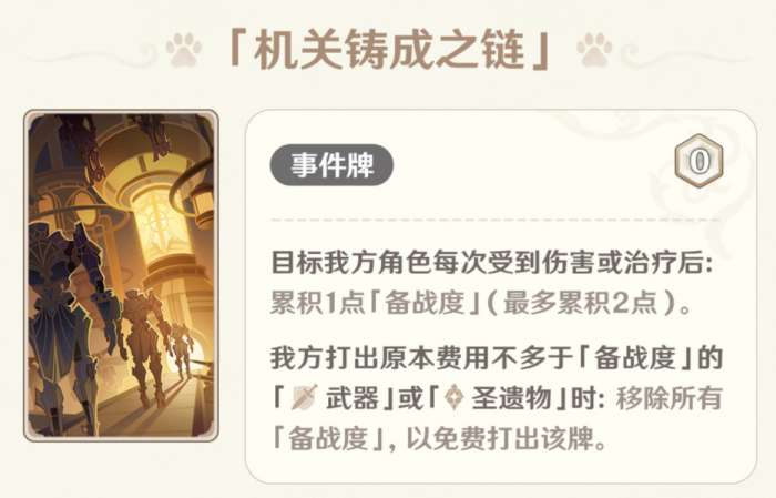 这是什么废物卡?显然本来备战度是可以到3的,但是因为太强才改成2,可是2费装备压根就不是核心,也轮不到机关铸成之链来减费,所以说和花散里一样,设计师这波是自吞苦果。