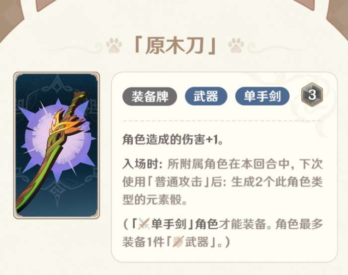 又是森林系列武器,不过设计师总算没有再给单手剑角色元素战技单次减2骰的效果,毕竟藏锋何处的热度最近远远不如琴音之诗。作为入场时特效的武器流组件,原木刀来得显然不是时候,如今拥有如此多回复元素骰的能力,尤其是饰金之梦一天不削,森林系列就一天难以出头。但是这张牌强度肯定是有保障的,给一些普攻附魔的单手剑角色使用都没有问题,因此我想平时总还是能有好发挥的,只不过赛场上未必能够见到。