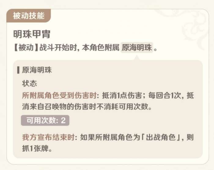 由于原海明珠效果,回合末停留在千年珍珠骏麟会比较好;注意分号位置,减伤效果始终是存在的,而抵消召唤物伤害不消耗可用次数的效果是每回合限一次