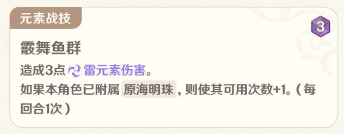 元素爆发则没有了讨债人那样的爆发能力,转而是3段3伤雷元素附着以及重新附属原海明珠,直伤还是非常低的,但如果减伤一直不断,节奏上还是相当赚的