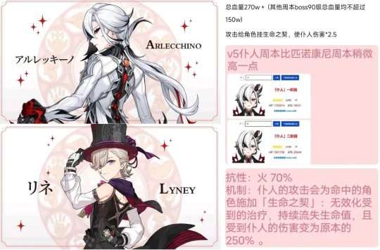 而在4.6的仆人周本中,周本BOSS仆人的总血量已经达到了270W+,其他周本BOSS90级总血量均不超过150W,攻击的时候会给角色挂上生命之契,使仆人的伤害变为原本的250%,好家伙,感情仆人也只是在周本超模了,角色的话大家看看就好,具体还得看上线后的实测。