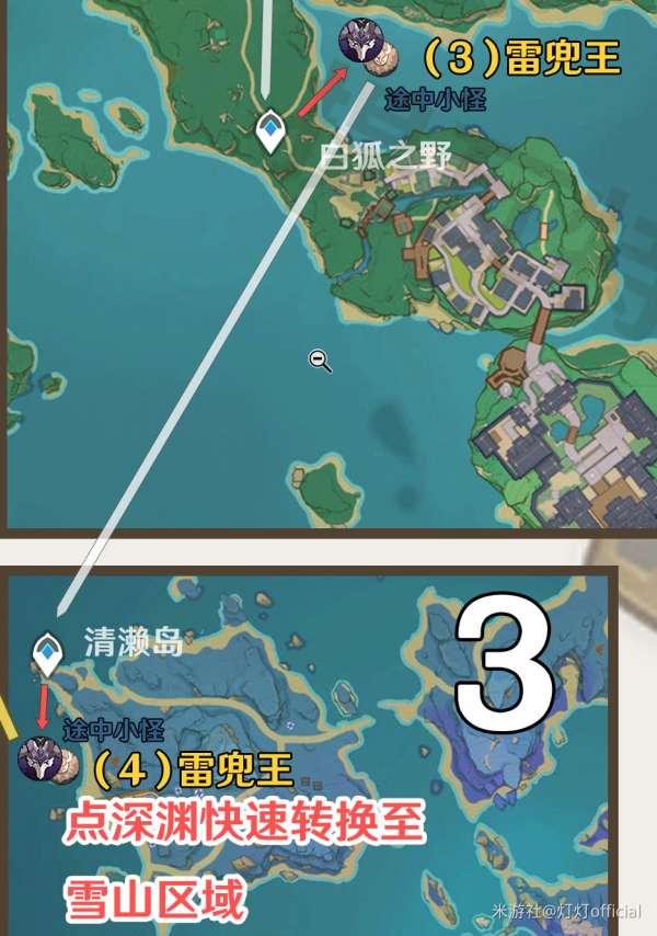 部分地图传送点之间跨度较大,比如稻妻清籁岛和雪山,可以通过点击地图右上角的深渊标志快速跳转。如果要前往枫丹,可以使用地图右下角的选区功能将地图切换到枫丹地区。