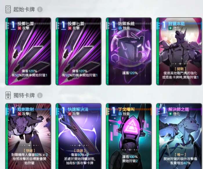 角色卡牌界面能看到8张牌和1个技能,上面4张为基本牌,肉鸽初始自带,下面4张为独特牌,肉鸽需灵光一闪解锁(初始卡组8张全有但无强化)。