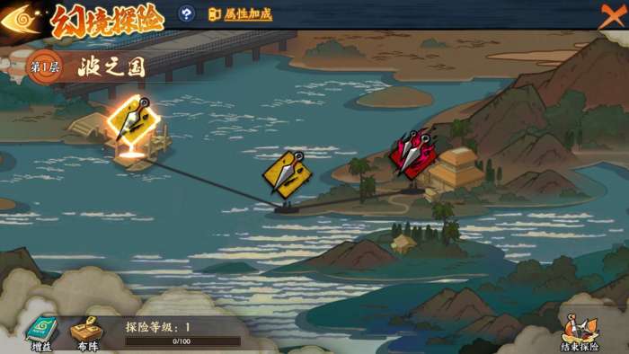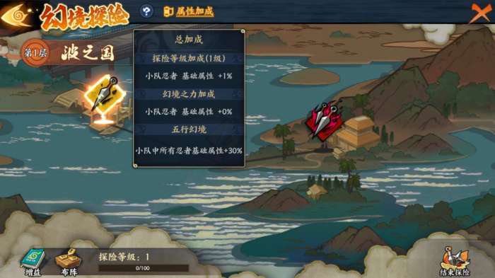 4、幻境中的敌人挑战难度将随着层数增加而变难,击败敌人可获得探险经验,累计探险经验可提升探险等级,用于对小队忍者提供额外属性加成;