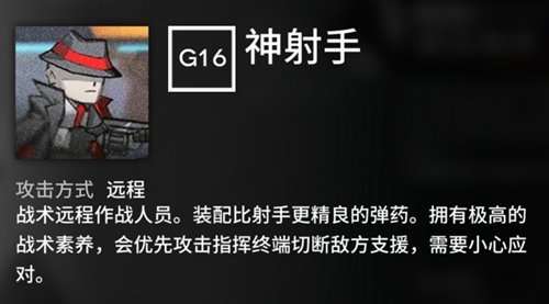 战术远程作战人员,配备比普通射手更优质的弹药。拥有极高的战术素养,会优先攻击敌方指挥终端以切断敌方支援,需要非常小心地对付。