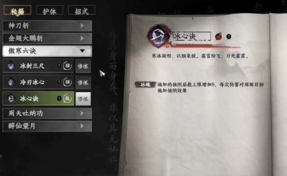 在傲寒六绝中还有一个招式名叫冰心诀,使用这一项技能之后就会给对方叠加蚀阴效果,叠加这个效果之后,对手的战斗能力就会被压制,并且还可以强化玩家的攻击,每一次在输出的时候能产生额外的攻击能力,如果想让自己的战斗能力更强,那就可以合理使用冰心诀,并且借助这一个招式,玩家在游戏里还可以持久战斗,可以在游戏里不断叠加战斗力,保证玩家的战斗输出。