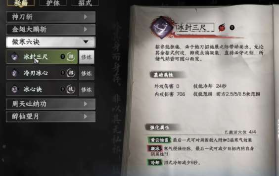 另外还有第二招名叫冷刃冰心,这是一个可以进行直线攻击的招式,每一次攻击都可以在玩家前方的15m范围内带来伤害,每次能让对手受到820的内功伤害,和冰封三尺伤害作用相当,只不过这个武功主打的是较强的输出能力,每一次释放都可以让对方身上叠加惊寒的效果,有了这个效果之后,每一次攻击都能带来额外的伤害,玩家可以借助这一项招式在游戏里频繁使用,这样就可以迅速消耗对手的生命,也是提升玩家战斗效率的一种方式。