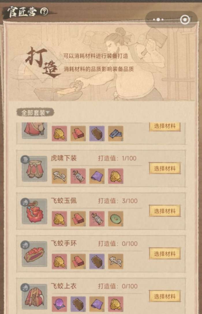这里能做4种套装(虎啸、飞蛟、神鹿、玄龟),装备分蓝、紫、橙、红4种品质。每做1件装备加1点,攒满100点必出紫装及以上。不过对脸黑的玩家来说,这个机制聊胜于无,最稳的还是攒4个红材料直接做,虽然奢侈,但能100%出红装,不会“歪”成其他品质。