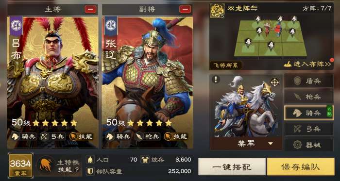 吕布武力成长更高,被动可提升暴击率、技能伤害,主动技可兼顾高系数爆发及续航效果,搭配张辽也特别暴力。这支队伍在练度高的情况下,可以在交战初期就打出高额队伍,比较推荐氪佬玩家选择(暴力、战功获取效率高)。