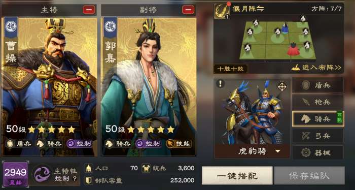 郭嘉与曹操一样可分别提供缴械、沉默控制,除了提供控制以外,郭嘉可提高部队技能伤害。魏骑有较不错的控制能力,输出表现更加出色;割须骑对于技能队有更好的控制效果。