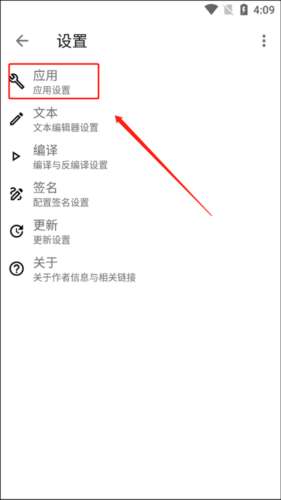 1、在软件界面选择“设置”,在“设置”界面中,点击“应用设置”设置项。