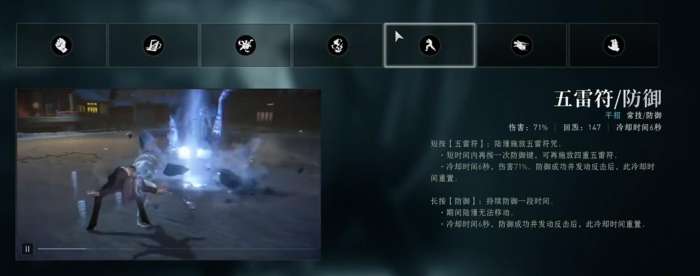 三技能双龙探爪是投技,100%伤害,必须在敌人近身时使用,抓取成功后能破防并造成僵直,被敌人防御时用这个技能特别管用,但前摇有点长,得预判对手走位,不然容易空抓。而绝技擎天提地伤害最高范围也大,释放时全程霸体,不过前摇明显,单独放容易被闪避,也是要穿插使用的。五雷符防御技能短按释放五雷符咒,长按则是进入防御状态,成功防御普攻后,进度条提示时机内点击普攻键触发反击,且反击成功会重置五雷符冷却。