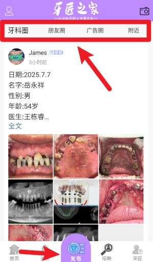 4、牙科圈模块支持发布病例、查看朋友圈与广告内容,还可根据地理位置浏览附近牙医分享。