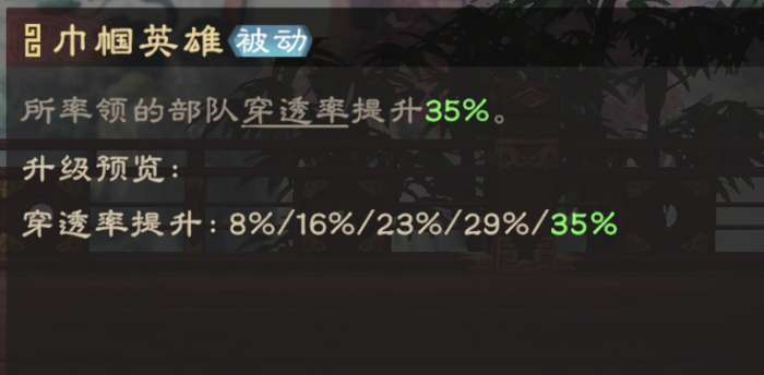 大家别急着通过数值否定这名武将,正如开头所说,弓兵队伍需要维持健康的兵力来打伤害,在输出的过程中会因为受到反击损失兵力。孙尚香可提供“高贵”的穿透率加成,降低队伍受到的反击伤害,是普攻流比较推荐的副将。