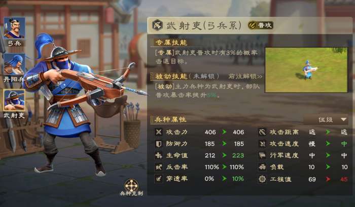 兵种:武射吏(概率击退、提升暴击)