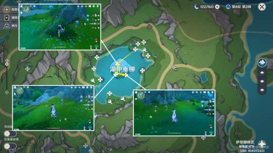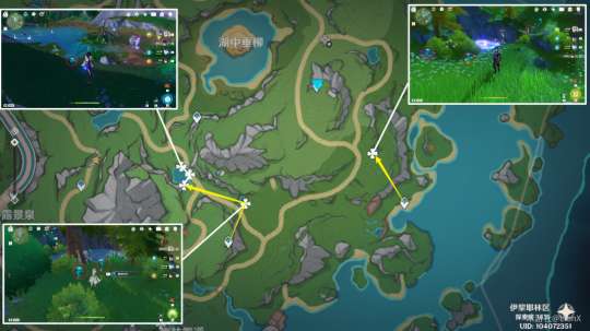 请注意,第四条和第五条路线中有标记为禽肉点位的地方需要先完成世界任务「伊黎耶的野精灵」系列任务(茉洁站喷泉处接任务),才能完全显示出来。湖中垂柳中心岛上有七个这样的点位,都需要完成任务才会显示。这部分路线目前仅为先行版,UP完成任务后会补充完整,包括全部路线。