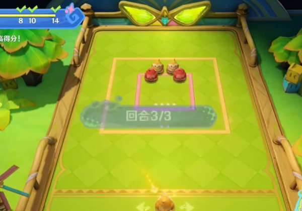 2、先选择贴贴球,移动到场地最左侧,等待虚线摇摆到场上的平平球左侧时,开始蓄力,在箭头两侧尖角的位置松开即可。