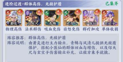 核心成员:萧炎(物理高伤)、邱尺尺(法术瞬伤)、青鳞(吸血免伤)、风清儿(窃怒免伤)、小医仙(群疗加攻)、玄重子(单体收割)。