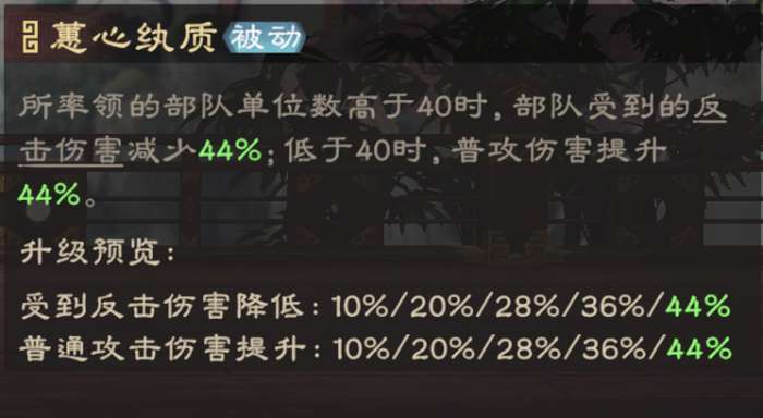 通过双被动,孙尚香可大幅降低队伍受到的反击伤害,可以利用弓兵的远程优势在相对安全的位置下白嫖输出(维持兵力稳定,也相当于提升持续伤害)。蕙心纨质在部队兵力低于40时还可额外提升普攻伤害,也是相当不错的增益。