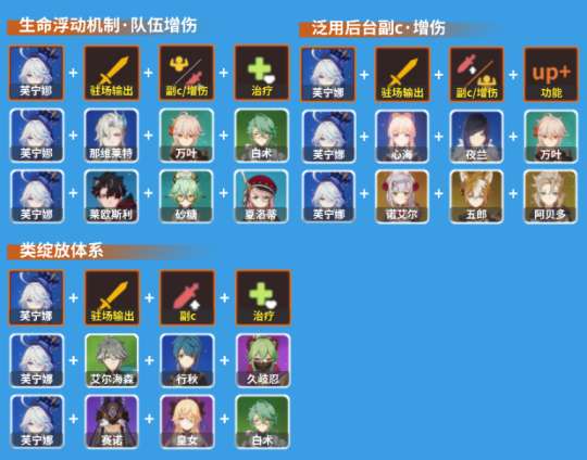 芙宁娜的机制非常泛用,可以适应任何队伍中缺少副C或增伤的情况。