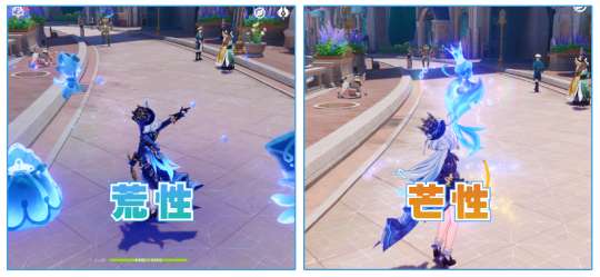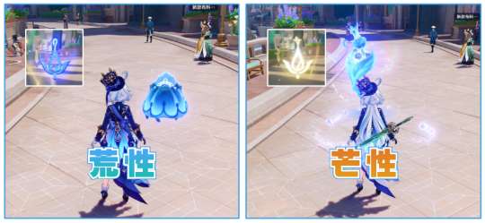 起始属性为荒性。使用其 E 技能后,场上的「沙龙成员」或「众水的歌者」也会随荒芒属性变化而变化。这些角色可以通过不同的颜色标记或召唤物来区分,荒性的角色外观没有双马尾,而芒性的角色则有白色的双马尾。