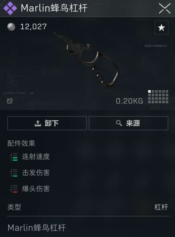 < Marlin蜂鸟杠杆>安装后可以大幅提升连射速度100→200发/分,小幅提升击发伤害70→75;降低爆头伤害133→112。除此之外,还会额外大幅提升护甲伤害25→59。
