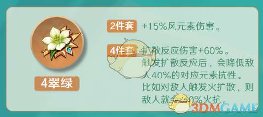 2、四件套效果:扩散反应造成的伤害提升60%。根据扩散的元素类型,降低受到影响的敌人40%的对应元素抗性,持续10秒。