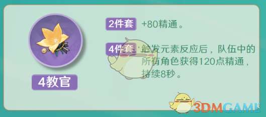 2、四件套效果:触发元素反应后,队伍中所有角色的元素精通提高120点,持续8秒。
