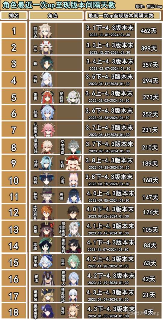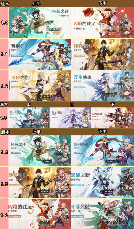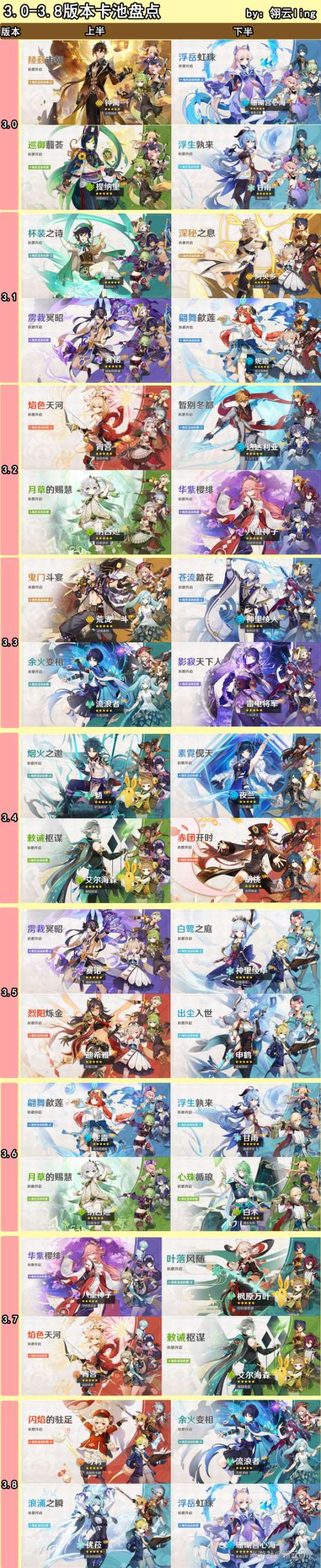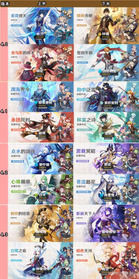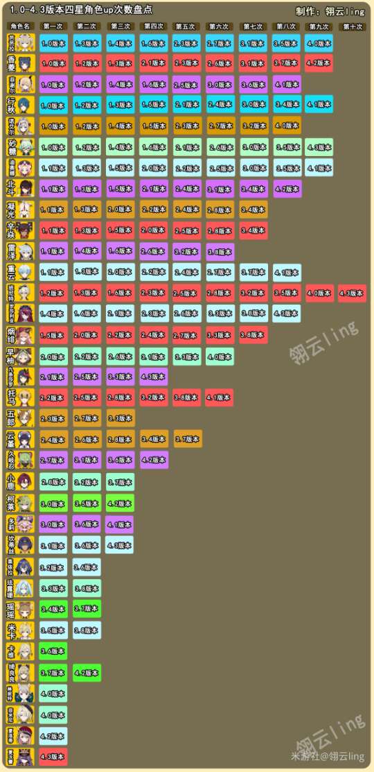 下图记录了所有角色的up次数及卡池对应版本从上到下,以角色进入卡池的先后顺序排序,颜色对应角色元素