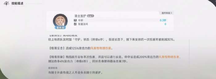 骑士加护属于星携技能,该技能会在莉莉离场的时候触发,技能触发以后们可以给接下来上场的队友附加上守护的效果,可以持续6秒钟,队友在该状态下,在受到敌人攻击时,其中有一次伤害能够被削减30%,若是进行极限反击的话,还能造成125%的风属性物理伤害。