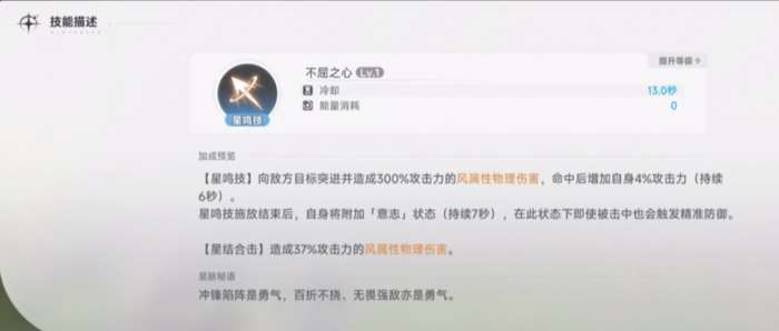 不屈之心是莉莉的星鸣技能,该技能使用以后,莉莉会向前方的目标进行突进,同时还能造成300%的风属性物理攻击,命中敌人以后,自身的攻击力还能增加4%,可以持续6秒钟的时间,星鸣技在结束以后,自身将会附加上长达7秒钟的意志状态,该状态下的她能够进行精准防御。