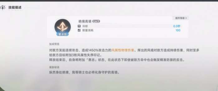 绝境高墙属于星决技能,该技能将会直接对敌人进行连续的攻击,能够造成高达1450%的风属性物理伤害,莉莉在该状态下所使用的风墙会对对手造成持续性的伤害,还能给敌人附加上3枚风属性的失序印记,技能结束以后,自身会进入意志状态,只要被敌人命中就能把精准防御给触发。