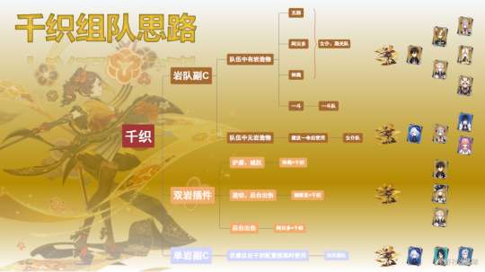 2.针对使用双岩插件(钟千,千娜)进行速切/后台出伤的玩家,如果只能停留在低命/无专武阶段的玩家,从性价比方面考虑,抽取千织并不是明智的选择。不过,千织在命座提升方面的表现非常离谱,使得有能力抽取2-4命的玩家能够获得良好的体验。使用千织可以用非常简单的操作就能得到偏单体高额直伤的回报。需要注意的是,如果使用娜维亚+千织的组合,而没有一命的话,千织的伤害会降低40%以上。因此,如果没有命座提升的情况下,非常不建议抽取或使用千织。
