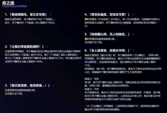 一命的起始增伤没有修改,仍然很高,但是叠层上限削弱了50,只提供了100。这个修改能更好地适应2命,因为现在2命更容易吃到生命增益了。不过在3命那里,上限又被补回来了,所以整体上来说这是一个积极的改动。