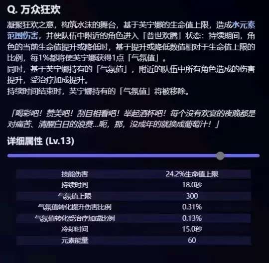 v3版本进行了修改,改动包括元素技能中召唤物的扣血量以及元素爆发能量的削减至60点。大招持续时间从原来的20秒降低至18秒,CD时间也削减至15秒。同时,大招的层数上限被削弱,但增伤转化率有所提高。此外,二命和六命座也进行了对调等等改动。这些修改对平民玩家非常有利,并且为芙宁娜的二命做了基础建设,让其更易上手。玩法逻辑没有根本性的改动,属于有点。不过,缺点就是大招的上限被削弱了。