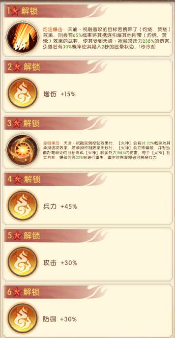 灼连爆击:天谕·祝融普攻的目标若携带了(灼烧,焚烧)效果,则会有65%概率将其携连引爆其他附带(灼烧,荧烧)效果的武将,使其受到天谕·祝融攻击力238%的伤害,引爆后有30%概率使其陷入2秒的眩晕状态,1秒冷却。